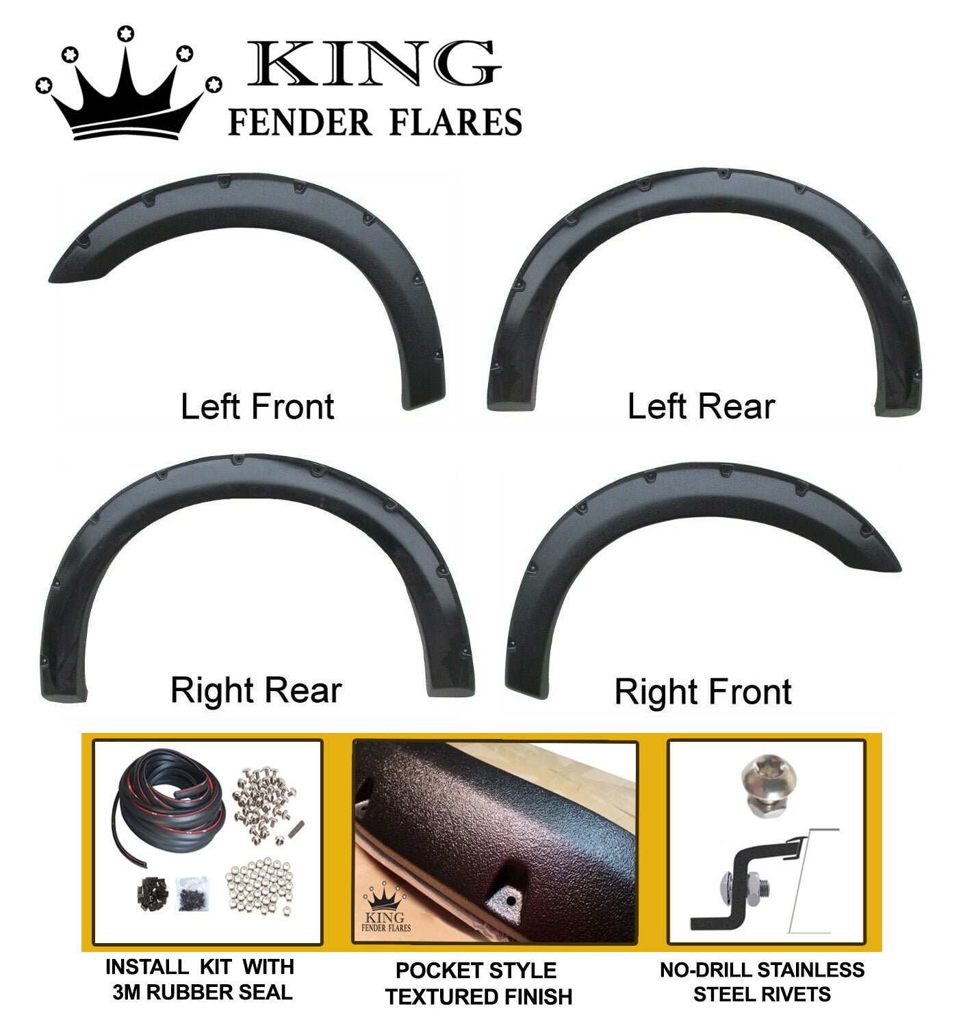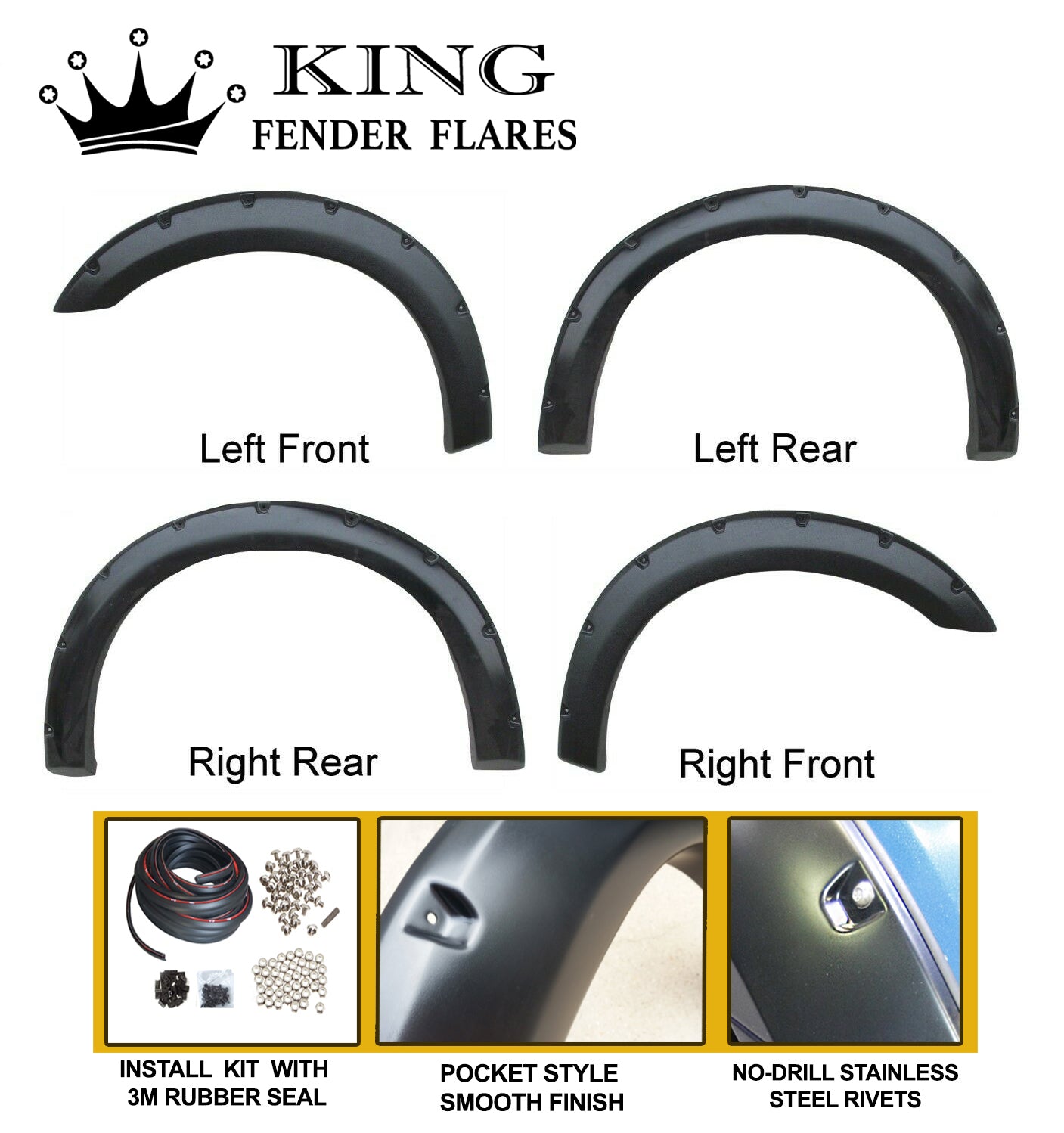 Pockets and stainless steel rivets give your truck a rugged look. No drill design. Attachments are made in the inner fender wall. All fender flares come in a set of 4 and have UV coatings and come un-painted. You can leave fender flares un-painted or have them painted to match your truck.