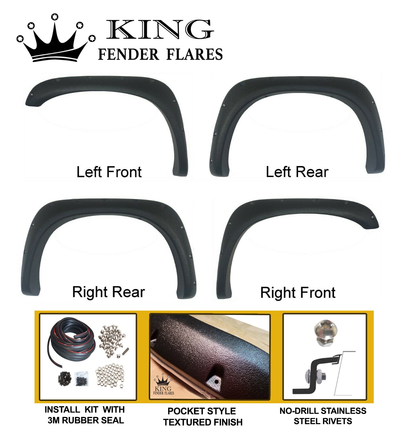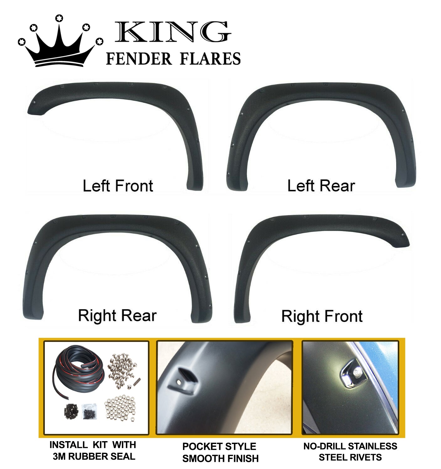 Pockets and stainless steel rivets give your truck a rugged look. No drill design. Attachments are made in the inner fender wall. All fender flares come in a set of 4 and have UV coatings and come un-painted. You can leave fender flares un-painted or have them painted to match your truck.