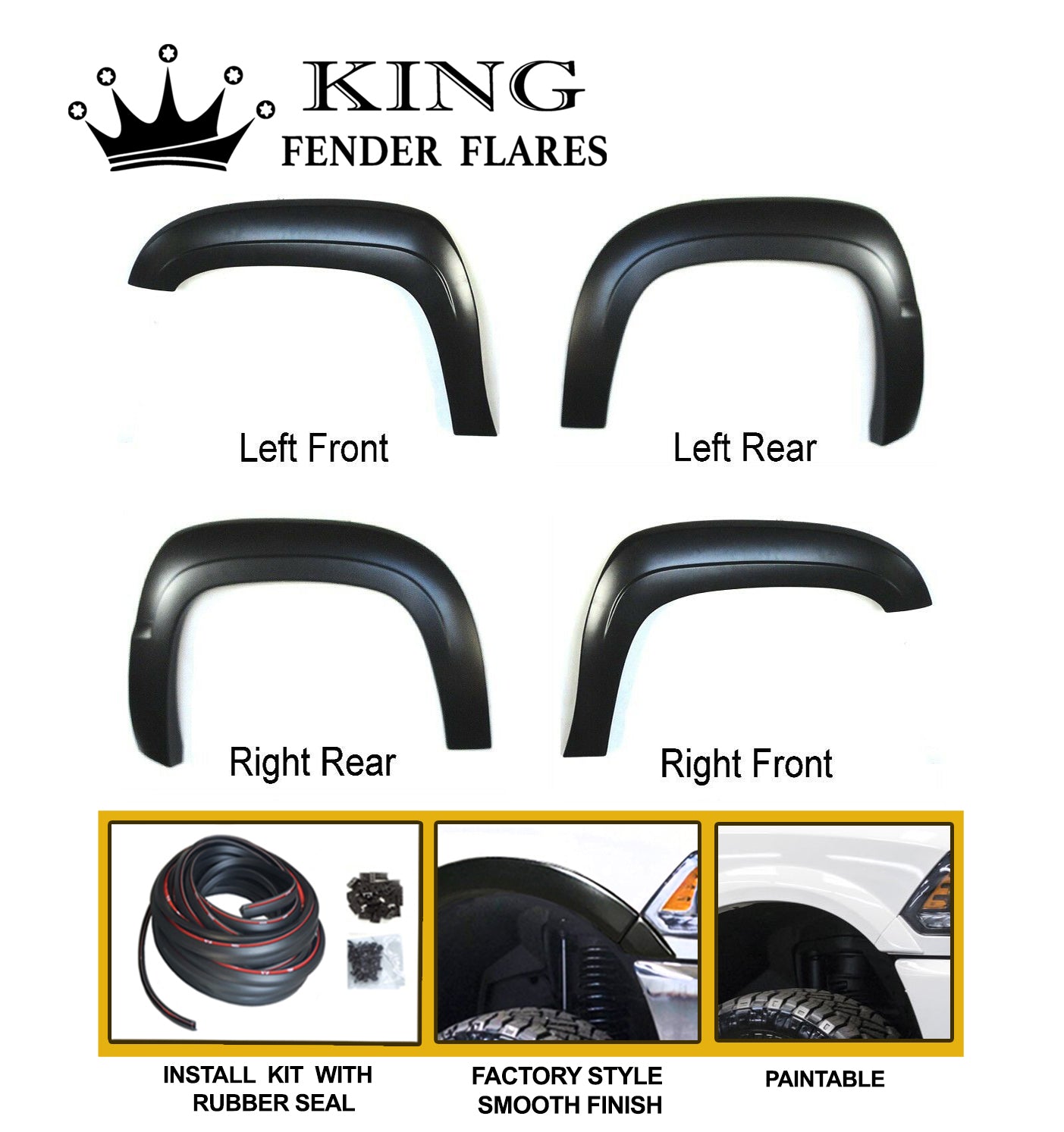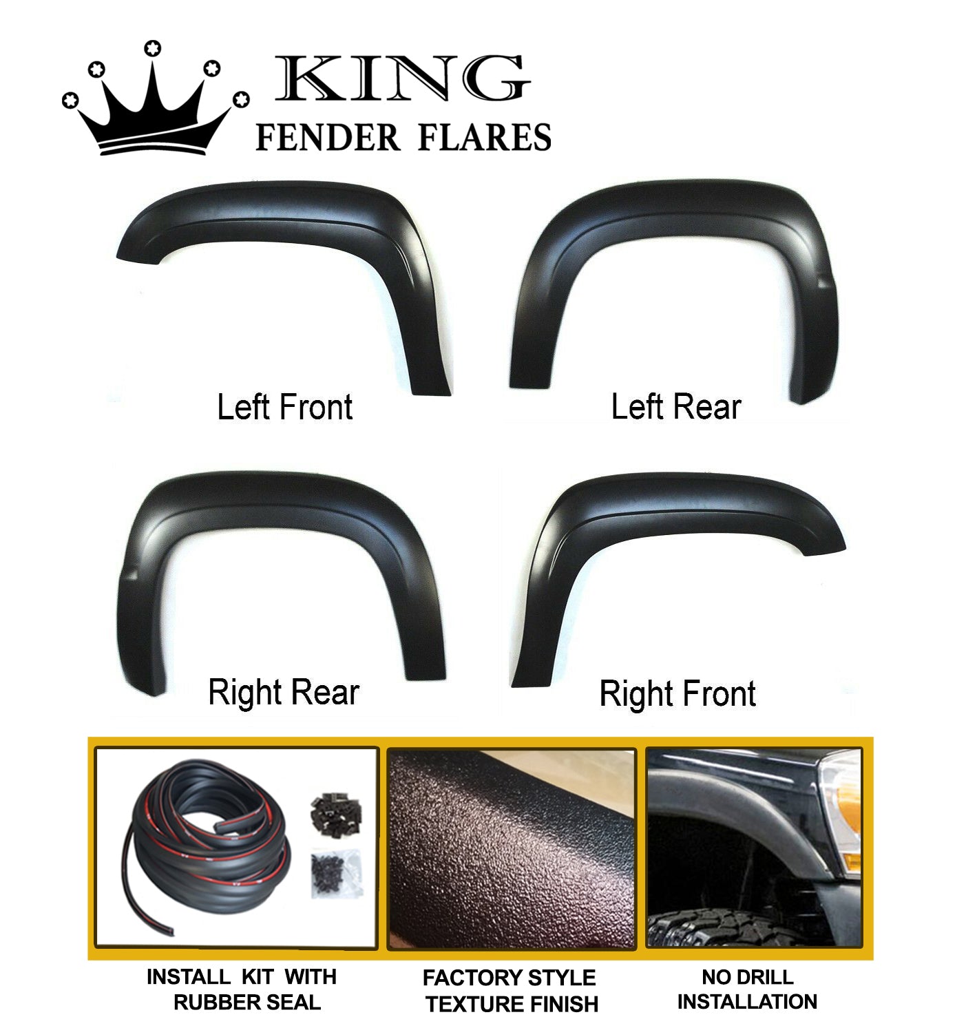 Manufactured for a factory-style look. Stylish fenders that give your truck a clean and sleek look. No drill design. Attachments are made in the inner fender wall. All fender flares come in a set of 4, have UV coatings and come un-painted. You can leave fender flares un-painted or have them painted to match your truck.
