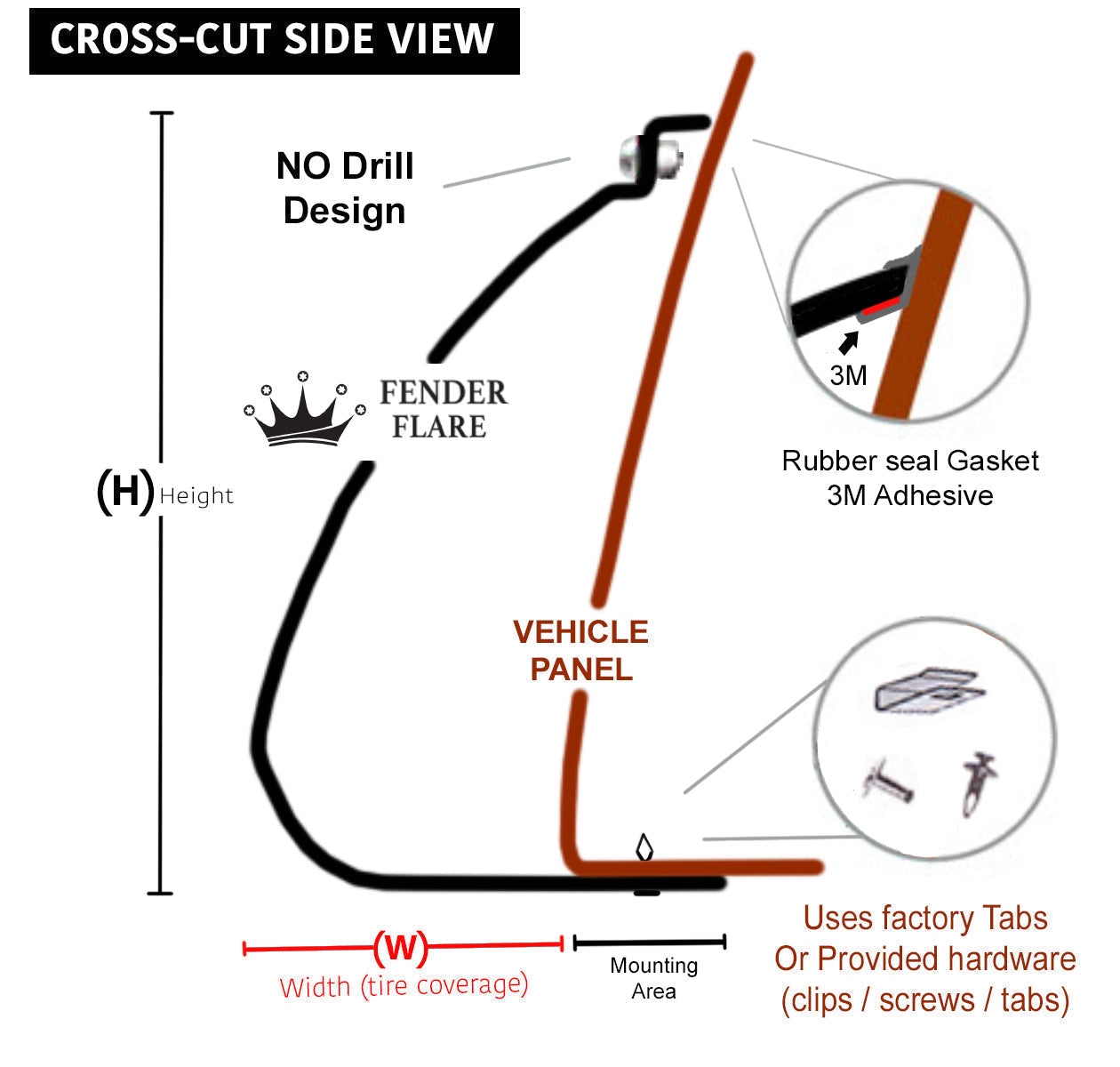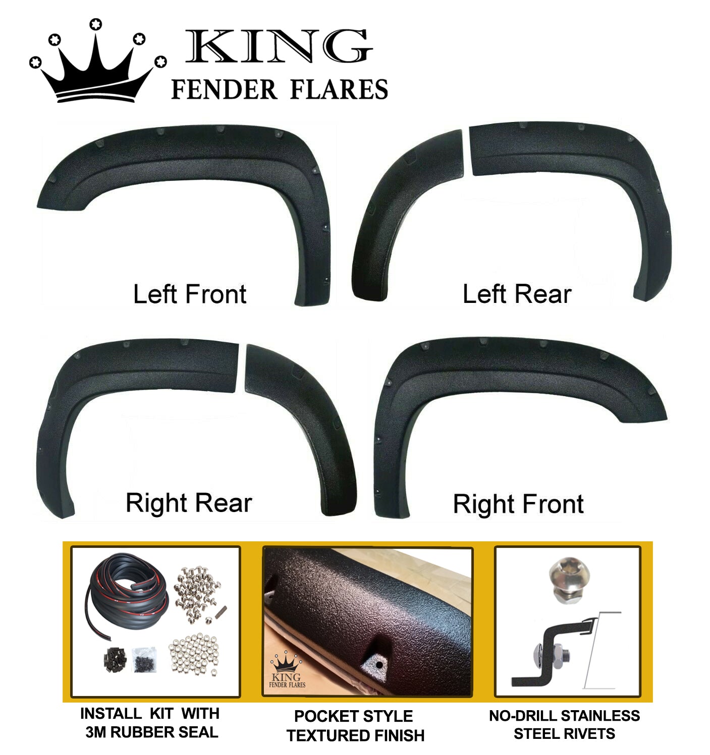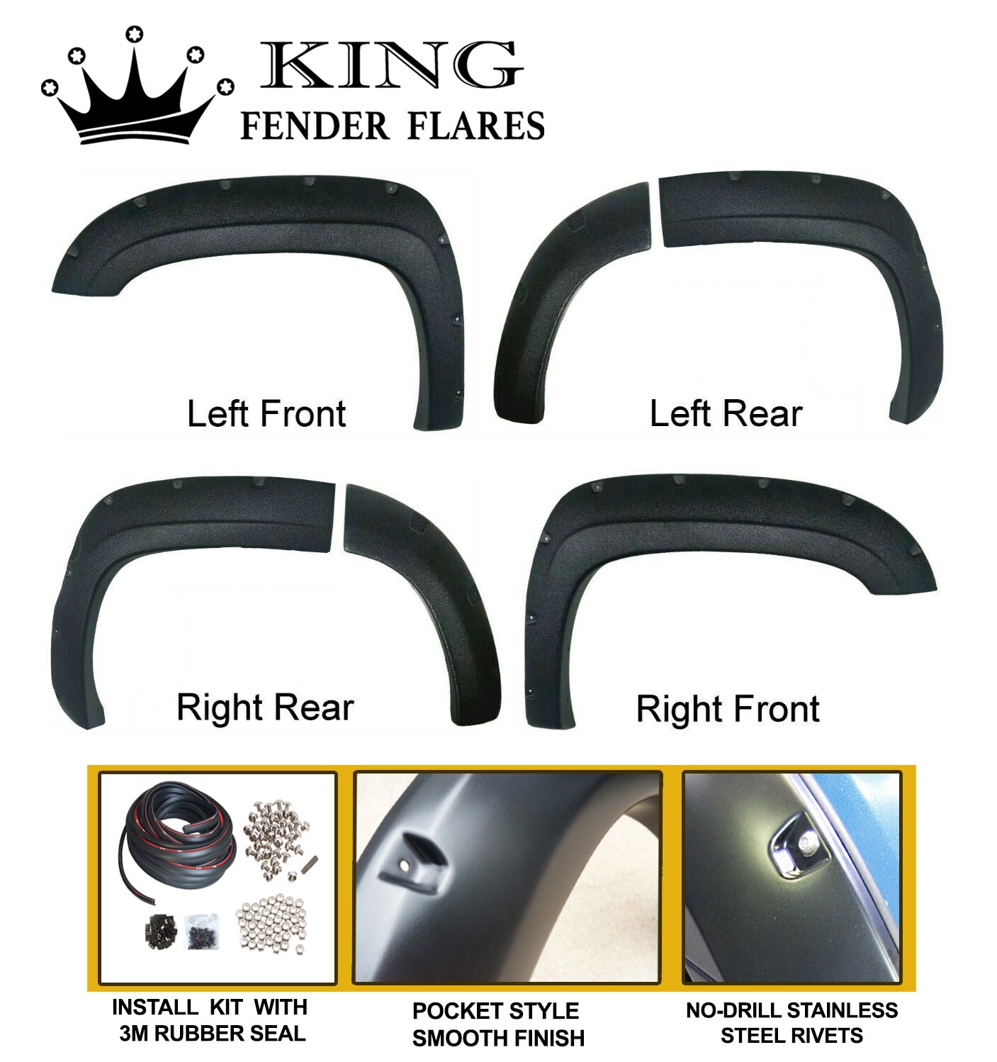 Pockets and stainless steel rivets give your truck a rugged look. No drill design. Attachments are made in the inner fender wall. All fender flares come in a set of 4 and have UV coatings and come un-painted. You can leave fender flares un-painted or have them painted to match your truck.