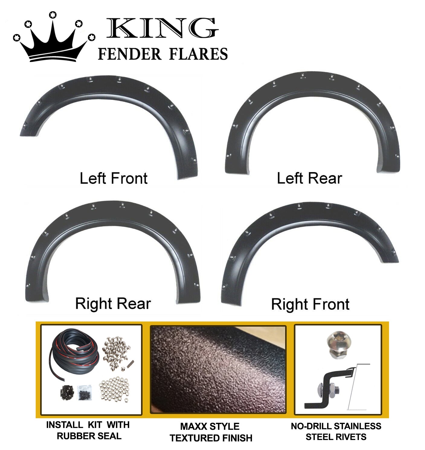 Maximum size inverted pockets on fender flares with stainless steel rivet bolts are what we call Maxx-Style. Stylish fenders that give your truck a maxed-out and aggressive look. No drill design. Attachments are made in the inner fender wall. All fender flares come in a set of 4, have UV coatings and come un-painted. You can leave fender flares un-painted or have them painted to match your truck.