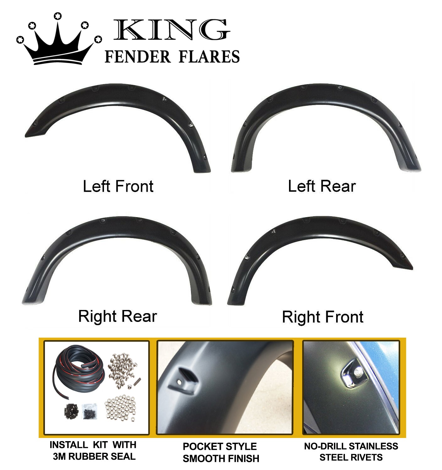 Pockets and stainless steel rivets give your truck a rugged look. No drill design. Attachments are made in the inner fender wall. All fender flares come in a set of 4 and have UV coatings and come un-painted. You can leave fender flares un-painted or have them painted to match your truck.